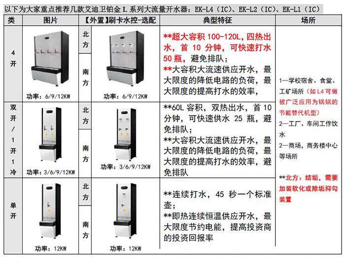 ----》iDIY步進(jìn)式:節(jié)能EK-L2和EK-L4系列,大容積大流速供應(yīng)開水,最大限度的降低電路的負(fù)荷,最大限度的提高打水的效率,避免排隊(duì);經(jīng)典產(chǎn)品:EK-B60IC 和 EK-B120L4IC(可附上重點(diǎn)產(chǎn)品特征)